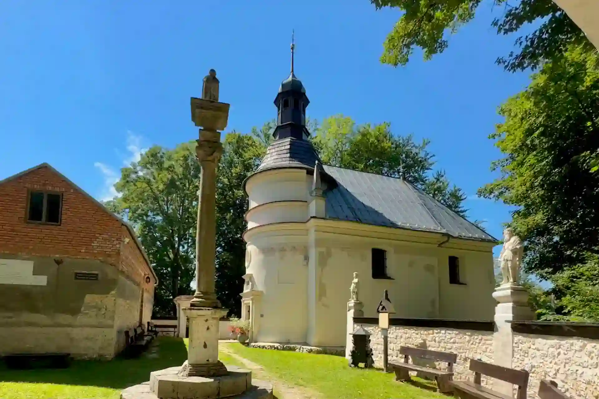Za kościołem stoi nieduży budynek z trzema sztucznymi grotami. To kaplice modlitewne zadedykowane kolejno: św. Marii Magdalenie, Zaśnięciu Matki Bożej i św. Janowi Chrzcicielowi. Ich dekoracja nawiązuje do wyglądu jaskiń – wnętrza zdobiły niegdyś sztuczne nacieki, jednak z pierwotnych upiększeń kapliczek zachowało się niewiele. Dawne napisy i freski są już nieczytelne.