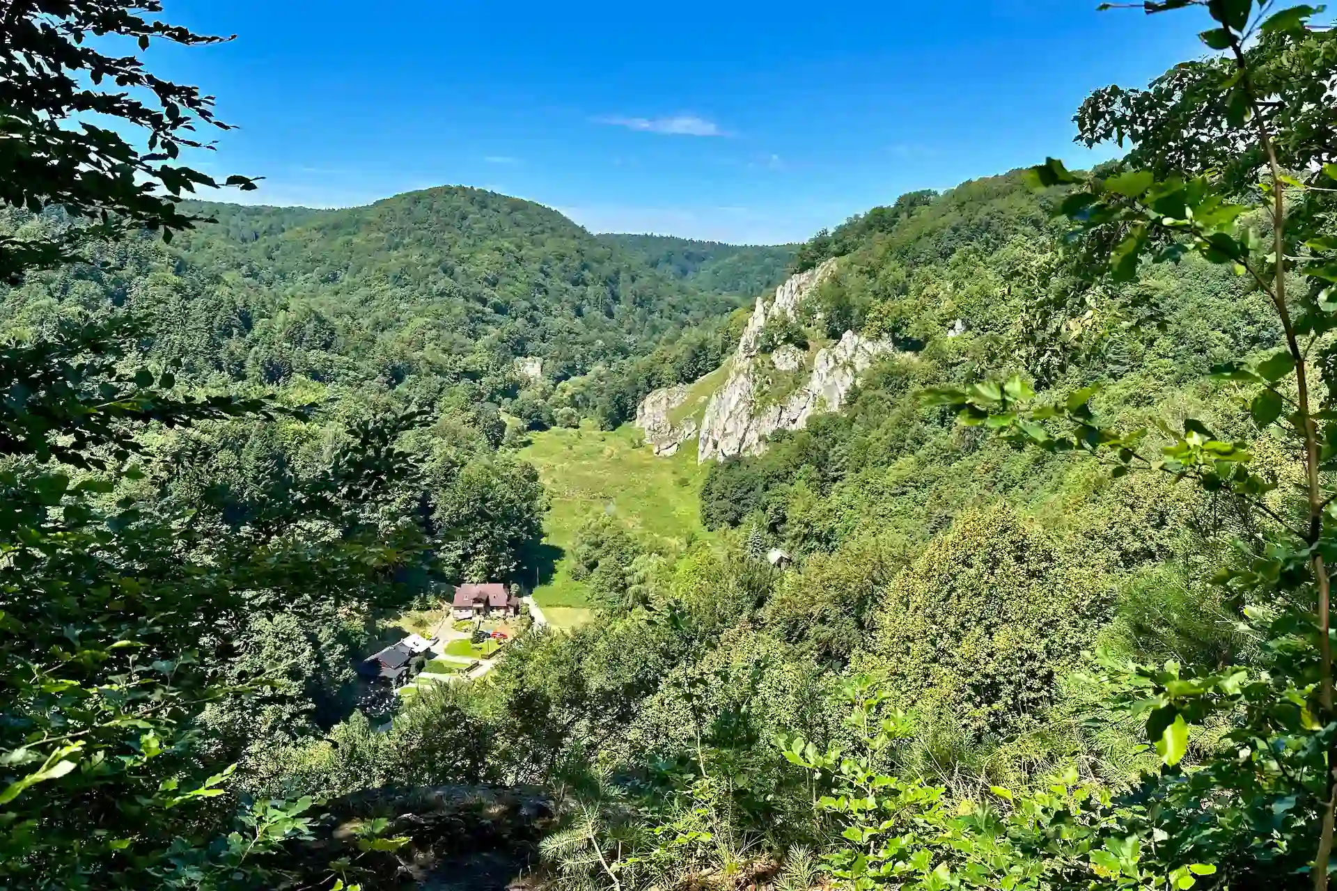 Spod jaskini po pokonaniu kolejnych 700 m dojdziesz do Jonaszówki. Leży ona nieco poza szlakiem, ale warto zboczyć na chwilę, by spojrzeć na Dolinę Prądnika i Ojców z kolejnego punktu widokowego. Spacer kontynuuj czerwonym szlakiem, wzdłuż Doliny Prądnika, aż do miejsca startu, czyli Ekspozycji przyrodniczej OPN.