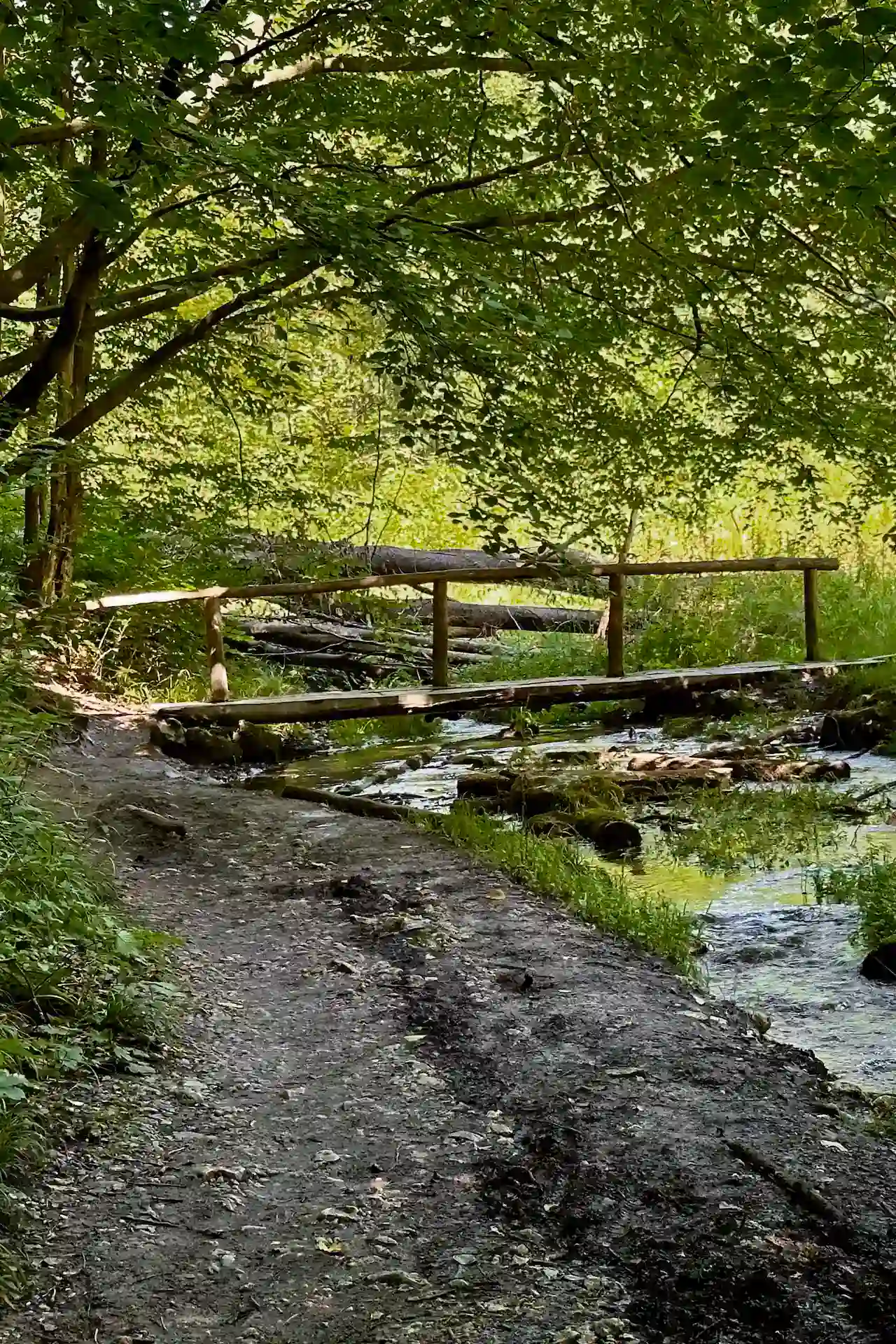Po pokonaniu ok. 1 km dojdziesz do dna Doliny Sąspowskiej. Szlak zielony kończy się w tym miejscu. Rozpocznij dalszą wędrówkę szlakiem żółtym, w kierunku Ojcowa (w drugą stronę szlak prowadzi przez Sąspów do zamku Pieskowa Skała). Już po kilku krokach żółtym szlakiem łatwo zauważysz, że całkowicie zmienił się charakter spaceru. Dno doliny jest dość płaskie, wędruje się wzdłuż meandrującego strumienia, tworzącego urokliwe zakola i rozlewiska.